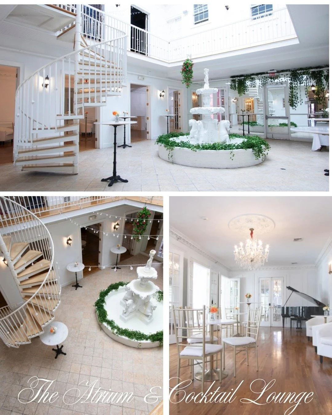 Exquisitely lit, this multi-faceted layout offers stately ambiance, privacy, and comfort, for your perfect day. The sky lit atrium, with dramatic fountain and cocktail area with grand piano, creates an air of sophisticated romance. A perfect setting for your event!